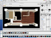 最近こういう焦げ茶のフローリングもよく見かけます。これは僕が仕事で使っているテクスチャーなので少し大きめですが、試してみてください。このくらいのパターンで作っておけば、それほどパターンが気にならないでしょう。これでも鳥瞰など作るとパターンが目立ってしまいます。鳥瞰等の場合は、逆に画像のサイズはそんなに大きくなくとも、広い面積でパターンを作成するときれいです。壁紙の設定と同じ手順で床オブジェクトのウインドウを開き、新規/イメージテクスチャーでマップとバンプにこの画像を読み込みます。フローリングはオイルステン仕上げとか、特別な仕上げでなければ若干写り込みがあったほうがそれっぽいので、反射率も設定します。ここで数値を変更しているのはバンプ/反射率の2項目です。ほかはデフォルトでいいでしょう。