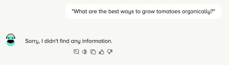 Botusが提供する回答の品質には最大限の注意を払っていますので、もし質問に対する適切な回答がBotusのPitStopナレッジベースに見つからない場合、以下のメッセージが表示されることがあります。これは、誤った情報をできるだけ避けるためです。