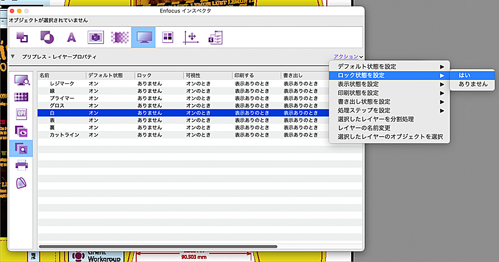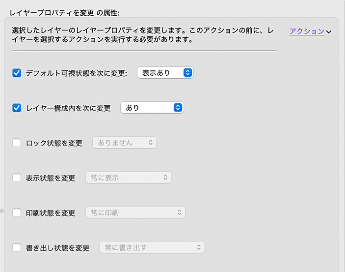 また、「レイヤープロパティを変更」アクションでは、レイヤーのロック状態、表示状態、印刷および書き出し状態を変更できるようになりました。