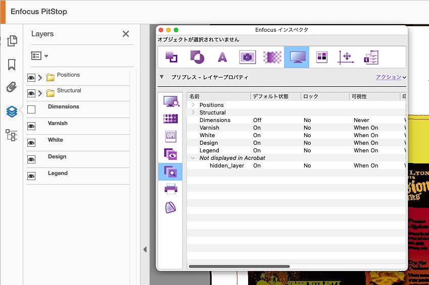 この新しい「レイヤープロパティ」パネルは、レイヤー構成に存在しないレイヤーの「表示」もサポートします。以下の例を見てください。「非表示レイヤー」というレイヤーが、PitStopのレイヤービュー内に表示されており、Acrobatでは表示されていないことが確認できます。