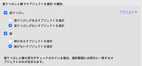 このアクションは、オブジェクトの塗りとストロークの状態に基づいて選択できる範囲を広げ、さらに多くの選択の可能性を提供します。