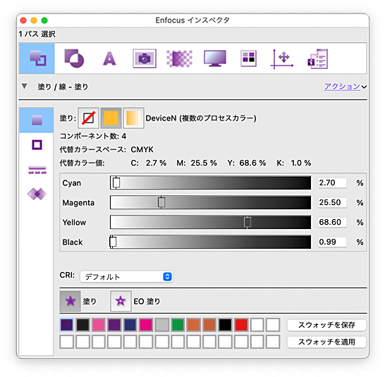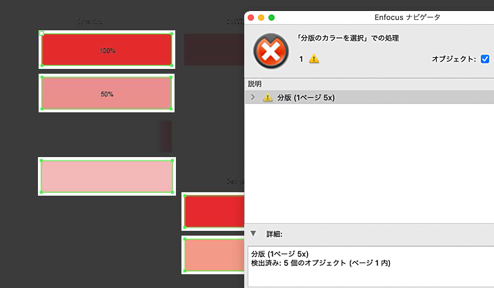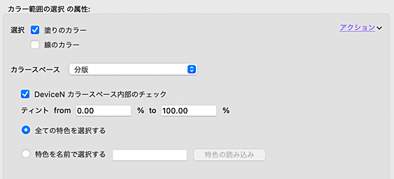 このアクションは改善され、DeviceNカラースペース内で色調を検索できるようになりました。例えば、分版カラースペースで濃度を指定してオブジェクトを探している場合、このアクションを以下のように使用できます。