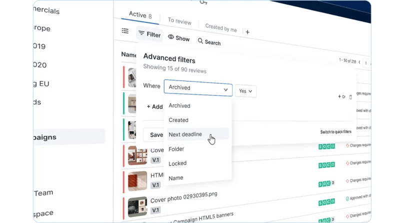 フォルダやタグ、柔軟なフィルターでプロジェクトを一元管理。必要なプルーフを、進行中でもアーカイブ済みでも、すぐに見つけ出せます。