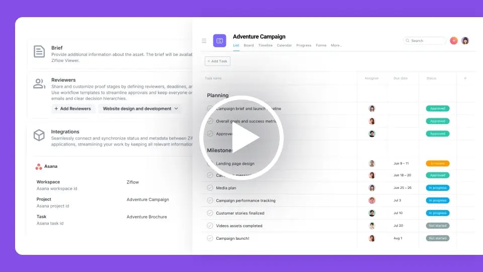 Ziflowの校正とAsanaのタスクを双方向で同期することで、アセットの進捗状況を自動的に追跡。承認までの流れをチーム全体で可視化できます。
