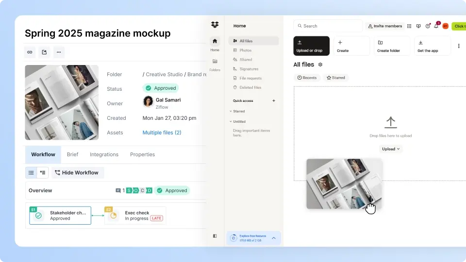 ZiflowとDropbox間で校正データ、コメント、承認結果をリアルタイムで同期させ、クリエイティブワークフローをスピードアップ。