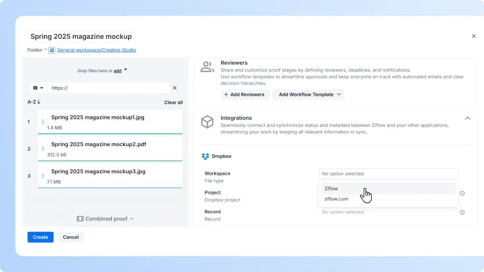 指定したDropboxフォルダにファイルを追加するだけで、Ziflowで新しい校正が自動的に作成されます。ワークフローテンプレートも自動で適用され、スムーズな共有とレビューが可能になります。