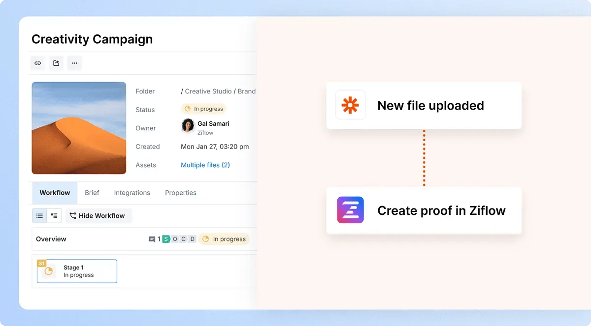 Zapierの強力なローコード自動化機能を使って、Ziflowを数百もの外部アプリと連携させ、繰り返し作業を自動化し、クリエイティブワークフローのあらゆる段階を効率化しましょう。