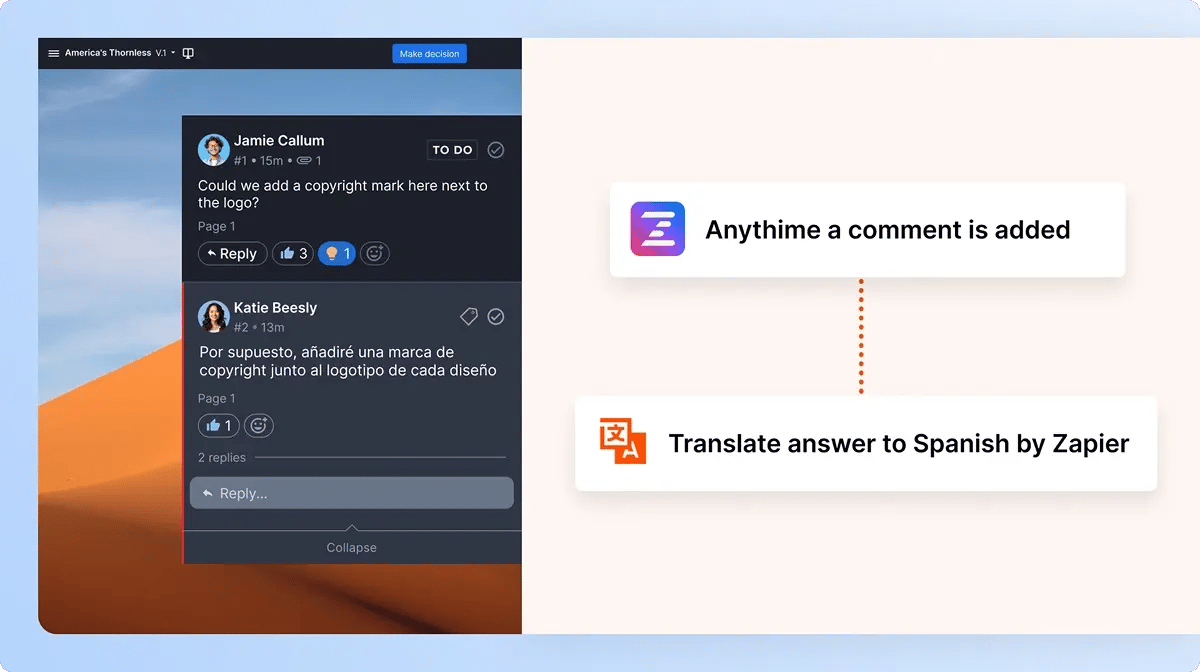 Zapierの翻訳アプリを使ってZiflowのコメントをチームが必要とする言語に自動で変換し、グローバルなコラボレーションを促進します。