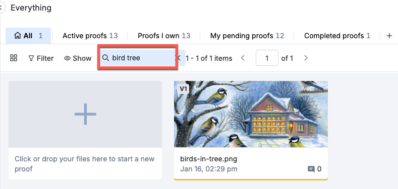 今回のリリースにより、検索はキーワード間に「AND」ロジックが適用されるようになりました。例えば「campaign 2024」と検索すると、名前に「campaign」と「2024」の両方を含むすべてのプルーフが表示されます。また、部分一致での検索にも対応しています。