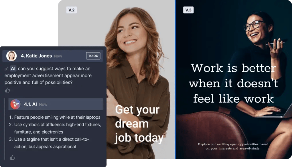 ZiflowのAI搭載チャットボットはクリエイティブな方向性を導き、アイデアを刺激する提案を行い、チームのレビュー過程を支援します。