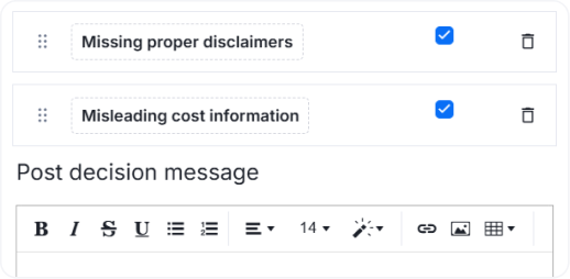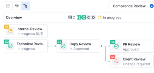 意思決定のためのチェックリストとレビュー担当者の追跡機能により、承認プロセスを効率的に管理し、次のステップを明確化。ボトルネックや遅延を軽減します。